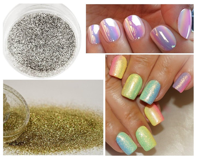Наносити блискітки можна за допомогою пухкої пензлика на не висохлий лак або втирати в липкий шар гель лаків. Маючи в своєму арсеналі всього один лак і кілька кольорів блискіток або присипок для нігтьового дизайну ви можете нескінченно багато разів створювати різні за фактурою, відтінку манікюр і педикюр.