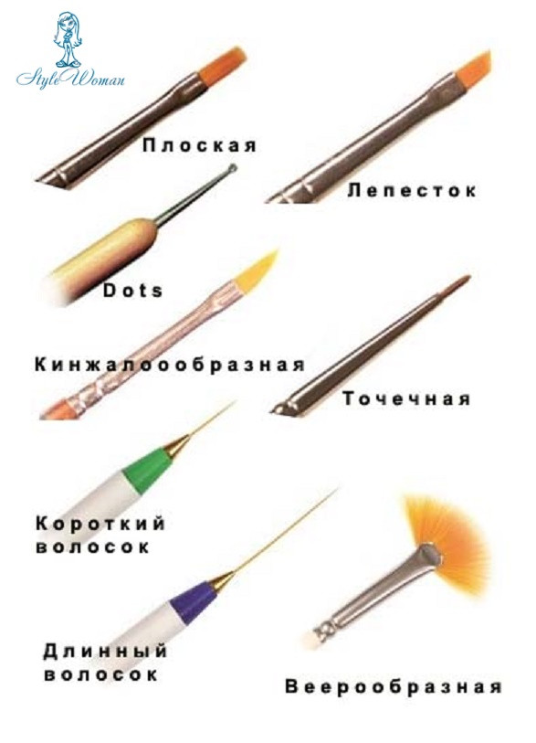 Різноманіття пензликів для дизайну та розпису нігтів. Кисті в наборах і поштучно, натуральні і штучні. Кисті для нарощування нігтів.